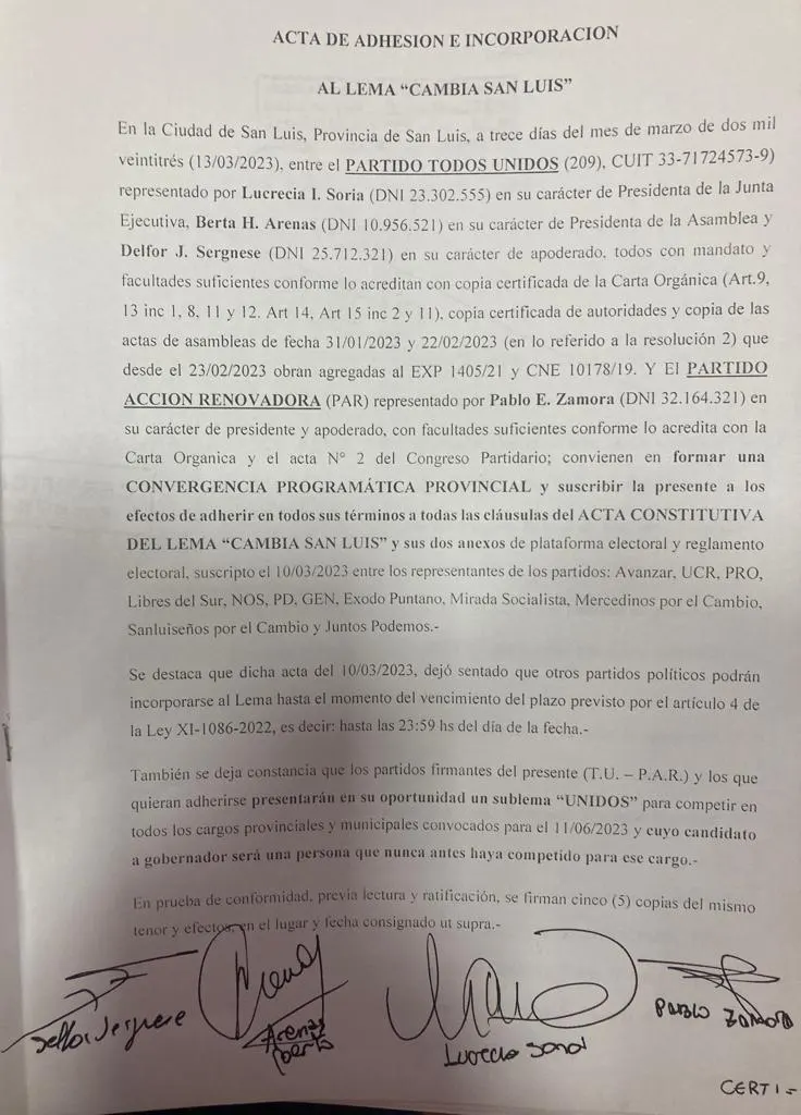 En dicha acta quedó expresamente señalado que oportunamente los integrantes de esa Convergencia presentarán el sublema “Unidos” dentro del lema “Cambia San Luis” “para competir en todos los cargos provinciales y municipales convocados para el 11 de junio y cuyo candidato a gobernador será una persona que nunca antes haya competido para ese cargo”.