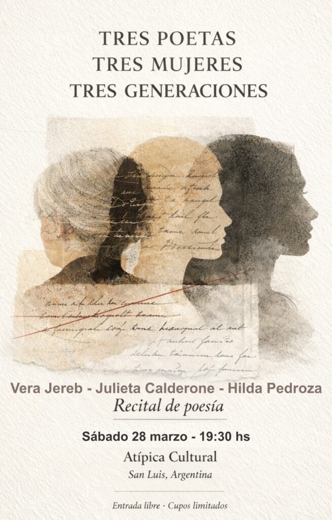 El sábado 28 de marzo a las 19:30 horas, la librería-café Atípica Cultural  —ubicada en San Martín 842— abrirá sus puertas para recibir a Vera Jereb, Julieta Calderone e Hilda Pedroza. Tres voces, tres recorridos vitales, tres formas de decir lo indecible. Jereb, mendocina; Calderone y Pedroza, foráneas que han hecho de San Luis su territorio afectivo y creativo. En las tres escritoras, la poesía no sólo se escribe: se habita.
