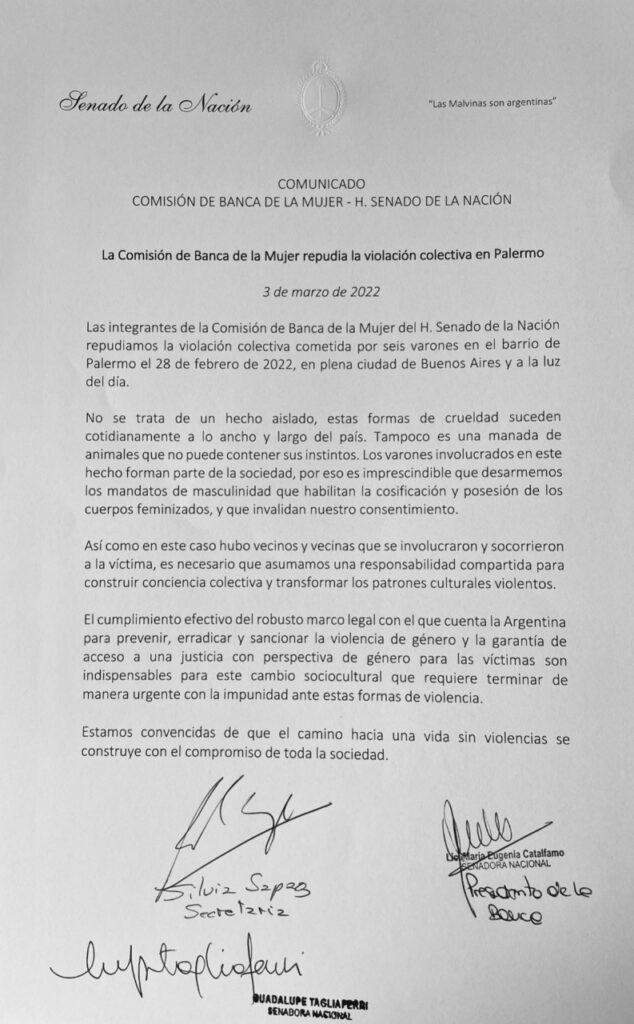 Las integrantes de la Comisión, hicieron referencia a la violación masiva que sufrió esta semana una joven en la Ciudad de Buenos Aires y elaboraron un documento consensuado en repudio a lo ocurrido en el que instan a la sociedad a comprometerse y asumir “una responsabilidad compartida para construir conciencia colectiva y transformar los patrones culturales violentos”.