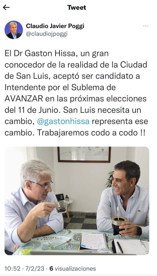 – Bueno, básicamente lo que nosotros primero y principal queremos es que lo voten a Claudio Poggi como gobernador, creo que cualquier política que podamos desarrollar o llevar a cabo sin el apoyo del gobierno de la provincia va a ser muy difícil. En segundo lugar, Gastón Hissa es alguien que se viene preparando y formando para gobernar la ciudad de San Luis y no durante el último mes de campaña, sino que la viene recorriendo, caminando y hablando con los vecinos durante estos últimos 8 años. Así que creo que no hay nadie hoy de ninguno de los candidatos que tenga ni la formación ni la capacidad ni las ganas de Gastón, que tiene muchas ganas de gobernar. Así que en segundo lugar, que lo voten a Gastón Hissa.