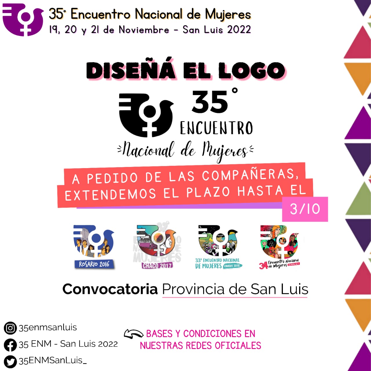 «A partir del 28° Encuentro Nacional de Mujeres que se hizo en San Juan en noviembre de 2013, cada sede ha tenido un logo propio. ¿Cómo se define ese logo? La Comisión Organizadora del Encuentro hace una convocatoria abierta para que cualquier mujer o diversidad que viva en la sede elegida cada vez, presente propuesta/s y un jurado elija entre las opciones recepcionadas. Este año, el objetivo de este «concurso» es el diseño y confección de un logotipo que ofrezca una imagen que represente al 35° ENM» señala el comunicado que invita a tomar parte del concurso.