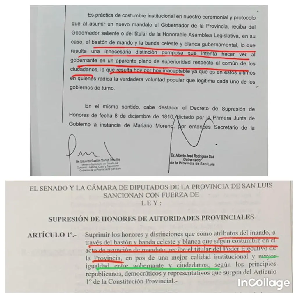 “El bastón de mando y la banda celeste y blanca resultan una innecesaria distinción pomposa que intenta hacer ver al gobernante en un aparente plano de superioridad respecto al común de los ciudadanos, lo que resulta hoy inaceptable…” (Fundamentos del Proyecto que enviara el Gobernador Alberto Rodríguez Saá a la Legislatura Provincial y sancionado como Ley NºV-0944-2016).