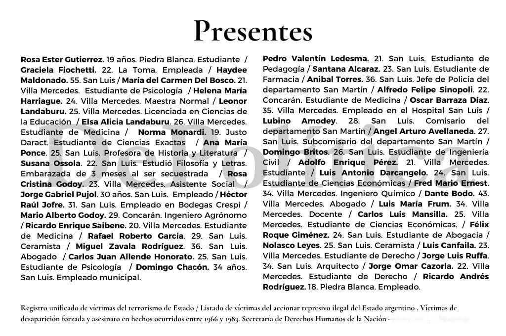 Treinta y nueve puntanos son mencionados en el registro unificado de Víctimas del terrorismo de Estado, en el listado de víctimas del accionar represivo ilegal del Estado Argentino, víctimas de desaparición forzada y asesinato en hechos ocurridos entre 1966 y 1983, según la Secretaría de Derechos Humanos de la Nación.
