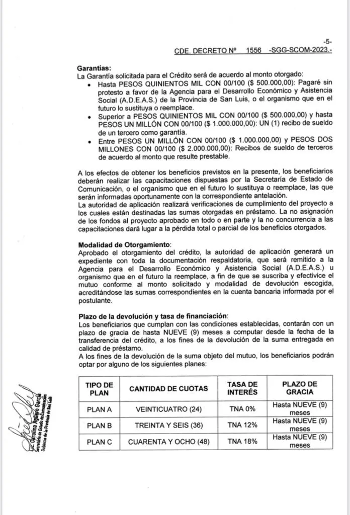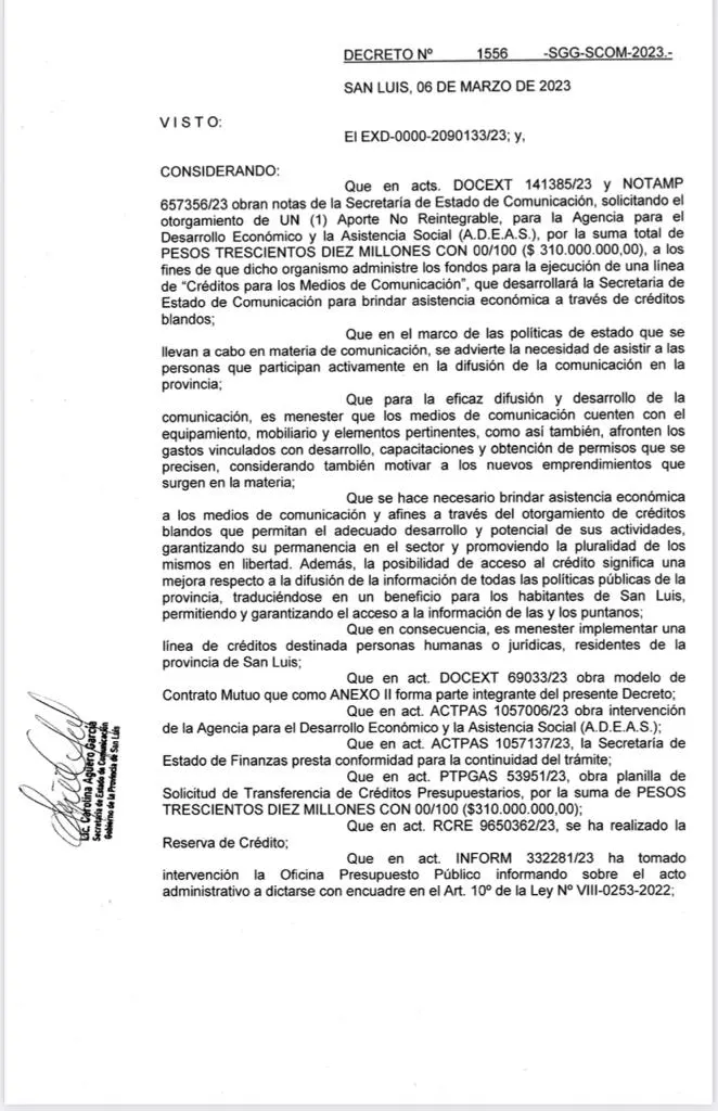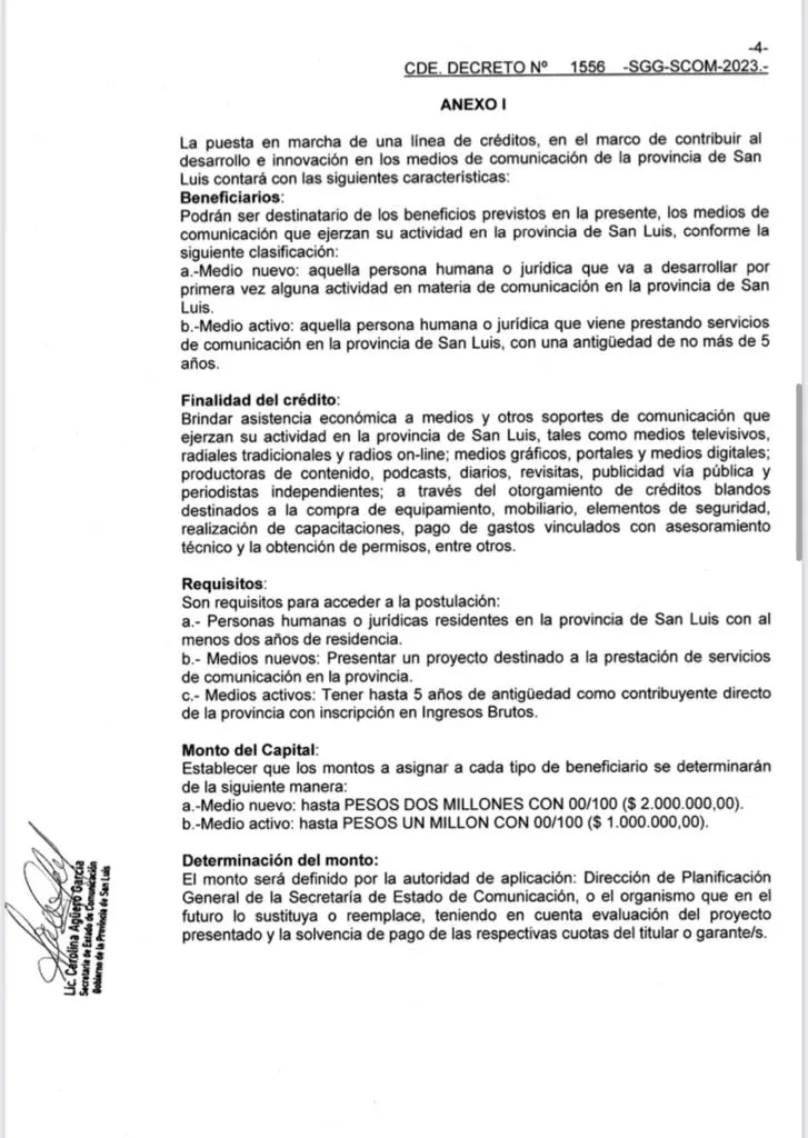 Esos fondos públicosserían destinados a “la ejecución de una línea de Créditos para los Medios de Comunicación que brindará la Secretaría de Estado de Comunicación para brindar asistencia económica a través de créditos blandos en el marco de contribuir al desarrollo e innovación en los medios de comunicación de la provincia de San Luis”. El anexo documental detalla los requisitos a cumplir por los eventuales beneficiarios de los créditos y los montos a asignar según el rubro de actividad.