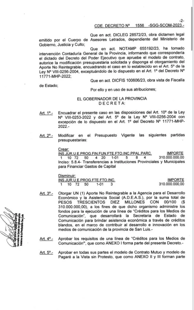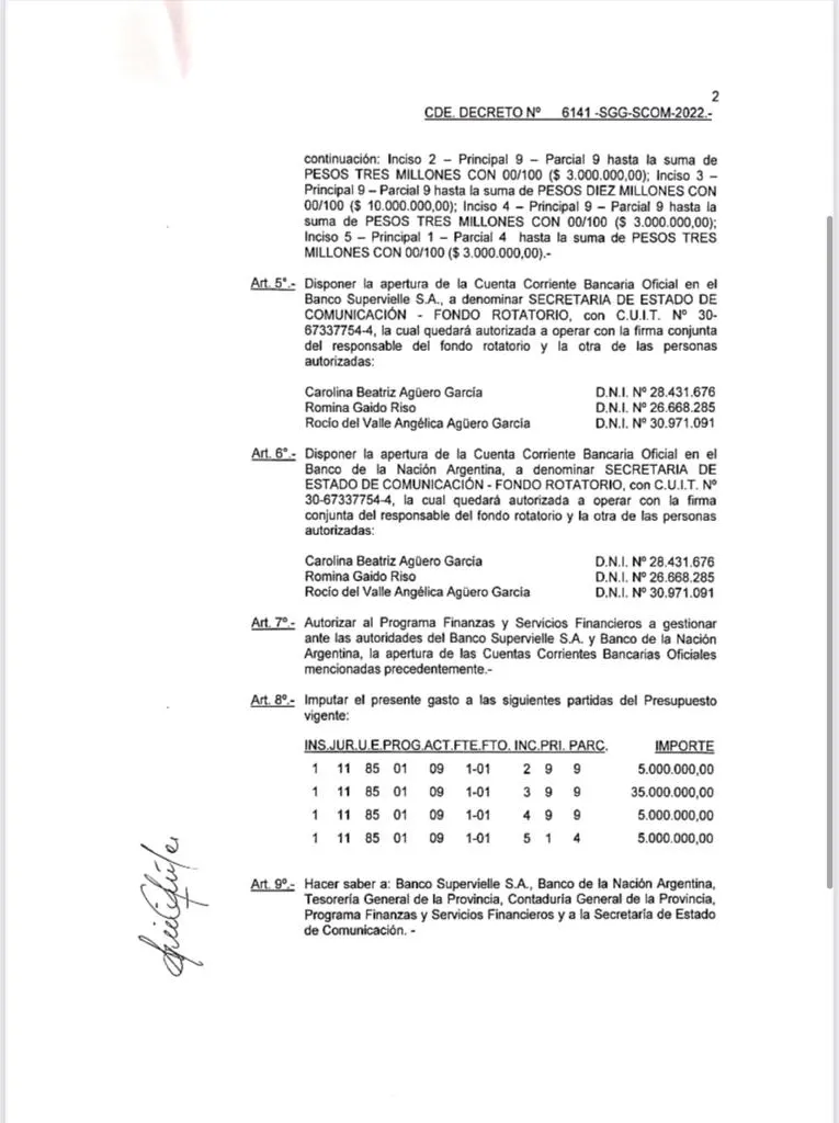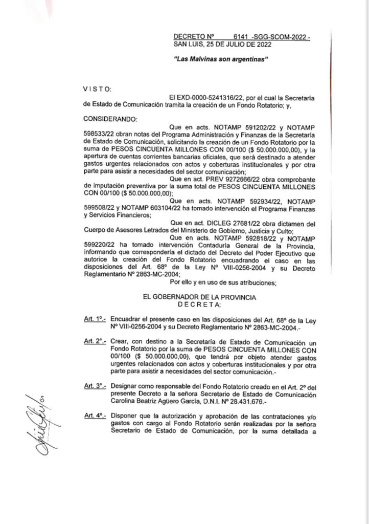 Los decretos, notas y anexos que hoy se revelan llevan las firmas del Gobernador Alberto, Rodríguez Saá y de la Secretaria de Estado de Comunicación, Carolina Agüero García y confirman la asignación de fondos públicos por un monto total de 360 millones de pesos.