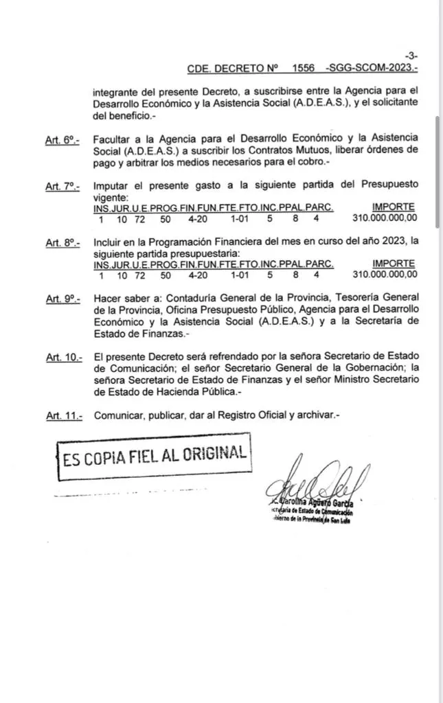 Junto a esa ampliación del Fondo Rotatorio salió a la luz el decreto N° 1556 de la Secretaría General de la Gobernación, a través del cual el Gobernador Rodríguez Saá dispone otorgar un Aporte No Reintegrable a la Agencia para el Desarrollo Económico y la Asistencia Social por la suma de 310 millones de pesos.