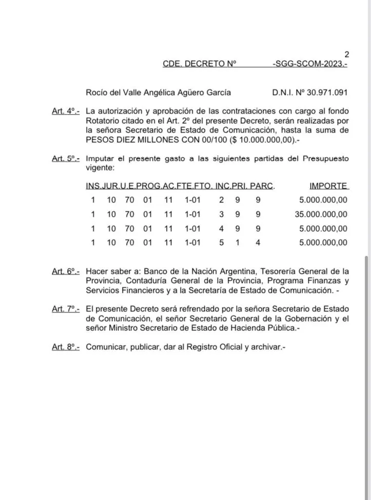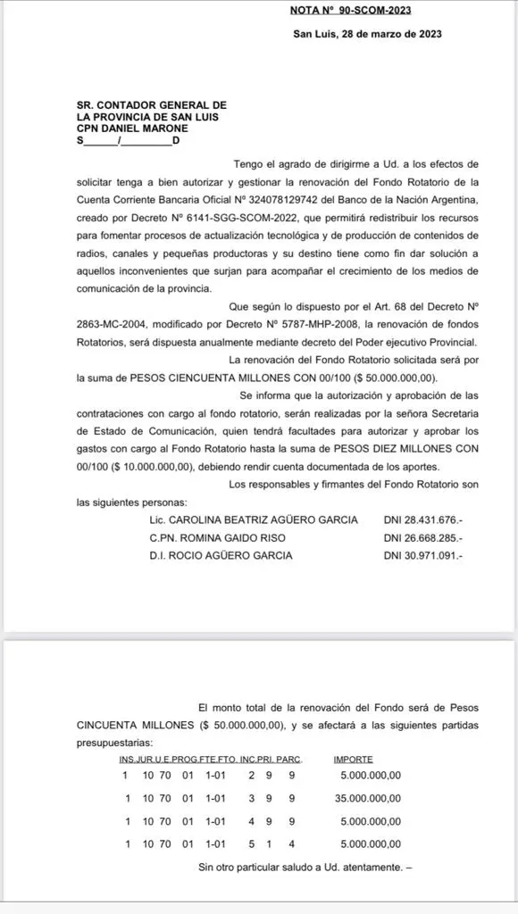 A través de esos documentos internos se solicitó y ordenó la renovación de un Fondo Rotatorio por cincuenta millones de pesos, y el otorgamiento de un Aporte No Reintegrable por un monto de 310 millones de pesos, depositados en cuentas bancarias a las que tiene acceso la secretaria de Comunicación, Carolina Beatriz Agüero García y -en el caso de los fondos rotatorios- su hermana Rocío del Valle Angélica Agüero García, también funcionaria.