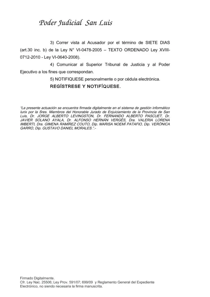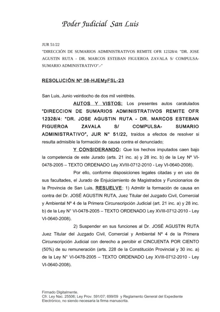 Los miembros del Honorable Jurado de Enjuiciamiento de la provincia de San Luis, Jorge Levington, Fernando Pascuet, Javier Solano Ayala, Alfonso Vergés, Valeria Imberti, Gimena Ramírez Couto, Marisa Patafio, Verónica Garro y Gustavo Morales resolvieron “admitir la formación de causa en contra del doctor José Agustín Ruta, Juez Titular del Juzgado Civil, Comercial y Ambiente N° 4 de la Primera Circunscripción Juidicial”.