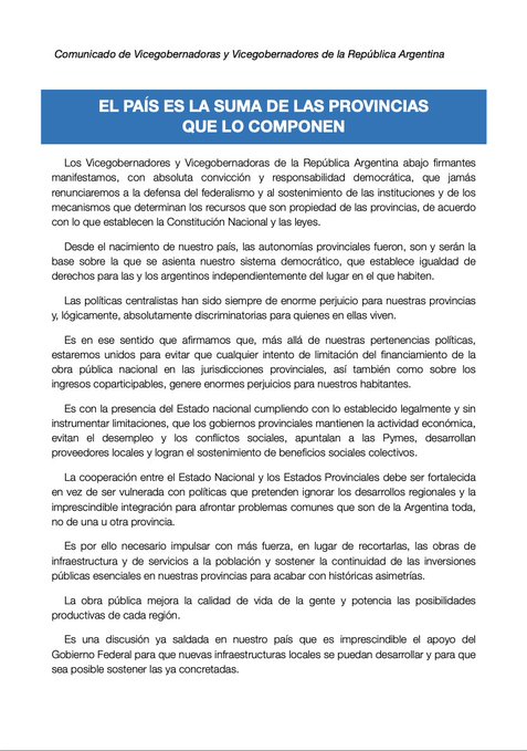 En el documento, los vicegobernadores pertenecientes al frente Unión por la Patria (UxP) manifestaron «con absoluta convicción y responsabilidad democrática que jamás renunciaremos a la defensa del federalismo y al sostenimiento de las instituciones y de los mecanismos que determinan los recursos que son propiedad de las provincias, de acuerdo con lo que establecen la Constitución Nacional y las leyes».