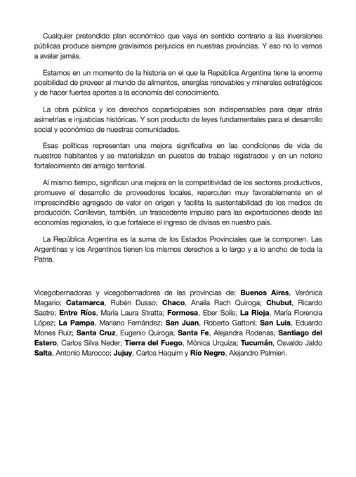 Los vicegobernadores firmantes son: por Buenos Aires, Verónica Magario; Catamarca, Rubén Dusso; Chaco, Analía Rach Quiroga; Chubut, Ricardo Sastre; Entre Ríos, María Laura Stratta; Formosa, Eber Solís; La Rioja, María Florencia López; La Pampa, Mariano Fernández; San Juan, Roberto Gattoni; y San Luis, Eduardo Mones Ruiz.