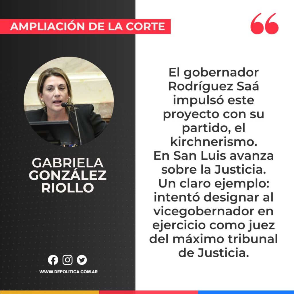 La primera de los puntanos en hablar fue González Riollo, quien votó en contra del proyecto. Concisa, dijo que la reforma afecta la independencia del Poder Judicial, la división de poderes y a la República.