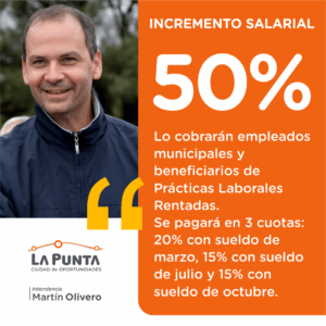 El aumento salarial del 50% para los empleados municipales, incluye a los beneficiarios de Prácticas Laborales Rentadas. “Es un incremento del 50% a abonar en tres cuotas, la primera de un 20 % con los sueldos correspondientes al mes de marzo, la segunda de un 15% con el sueldo del mes de julio y la última de 15% con el salario del mes de Octubre” dijo Olivero.