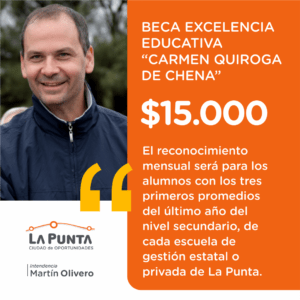 En tanto La beca a la excelencia educativa “Carmen Quiroga de Chena” será de 15 mil pesos mensuales para los tres primeros promedios académicos del último año del nivel secundario de los establecimientos educativos públicos de gestión estatal o privada de La Punta “para que puedan continuar con sus estudios superiores, sin impedimentos de tipo económico”.