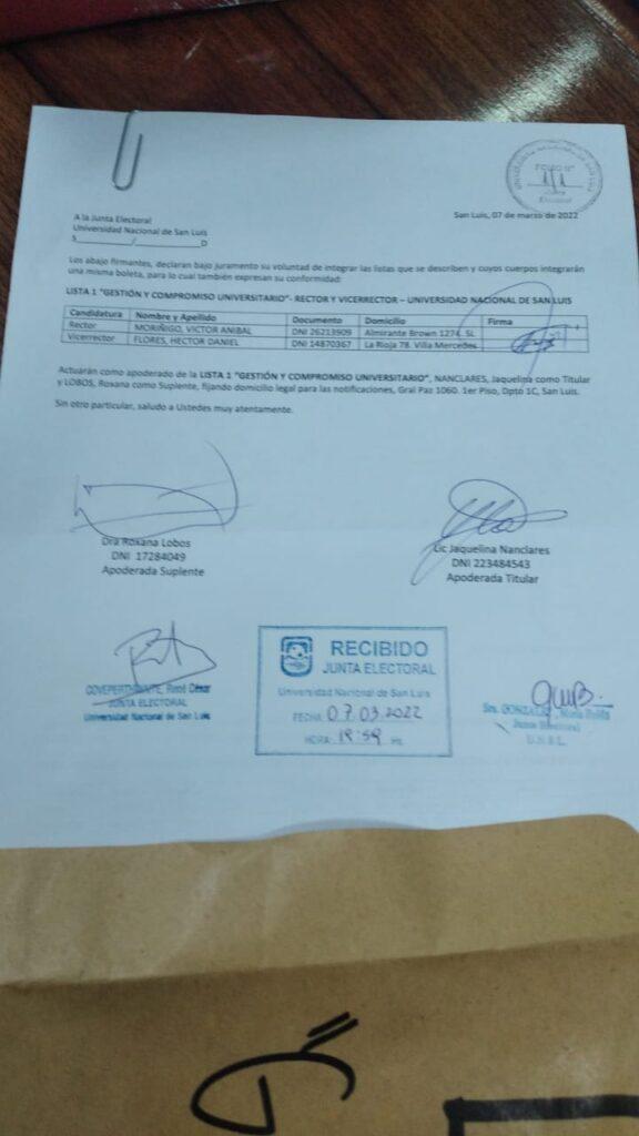 La Junta Electoral de la Universidad Nacional de San Luis confirmó la presentación de una única lista para competir en la elección por el cargo de Rector y Vicerrector de esa casa de estudios: la Lista “Gestión y Compromiso Universitario” que postula a Víctor Moriñigo y Héctor Flores.