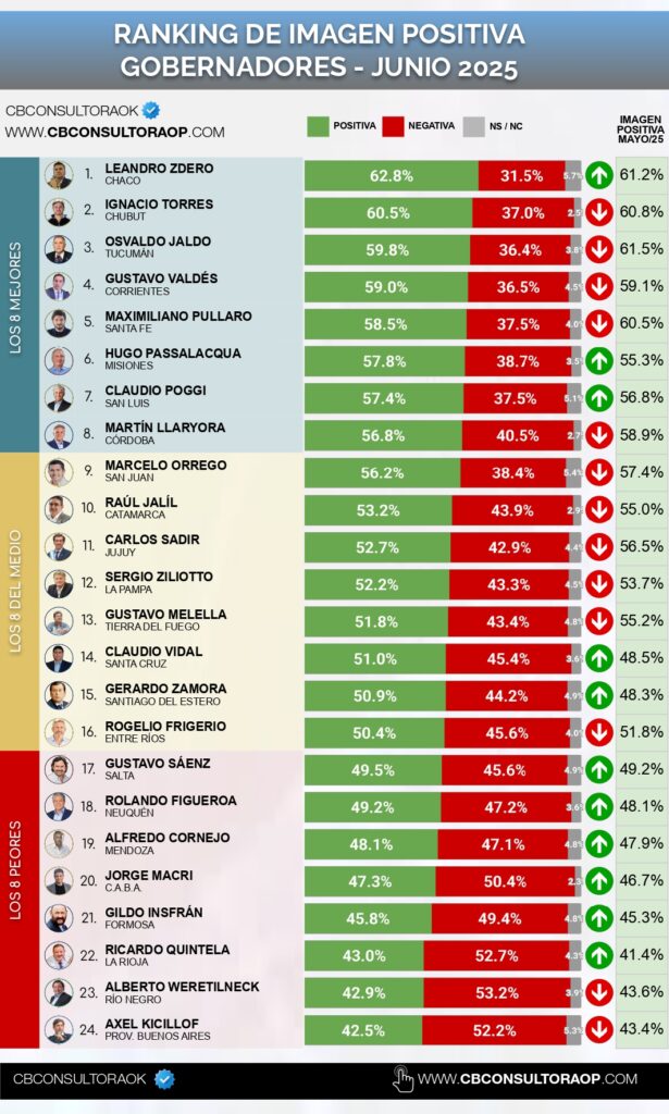 La lista de mandatarios provinciales mejor valorados está encabezada por Leandro Zdero (Chaco), Ignacio Torres (Chubut) y Osvaldo Jaldo (Tucumán), todos con niveles de aprobación superiores al 59%. Poggi se ubica dentro del grupo de ocho gobernadores con mejor imagen, por encima de dirigentes como Martín Llaryora (Córdoba), Marcelo Orrego (San Juan) y Raúl Jalil (Catamarca).