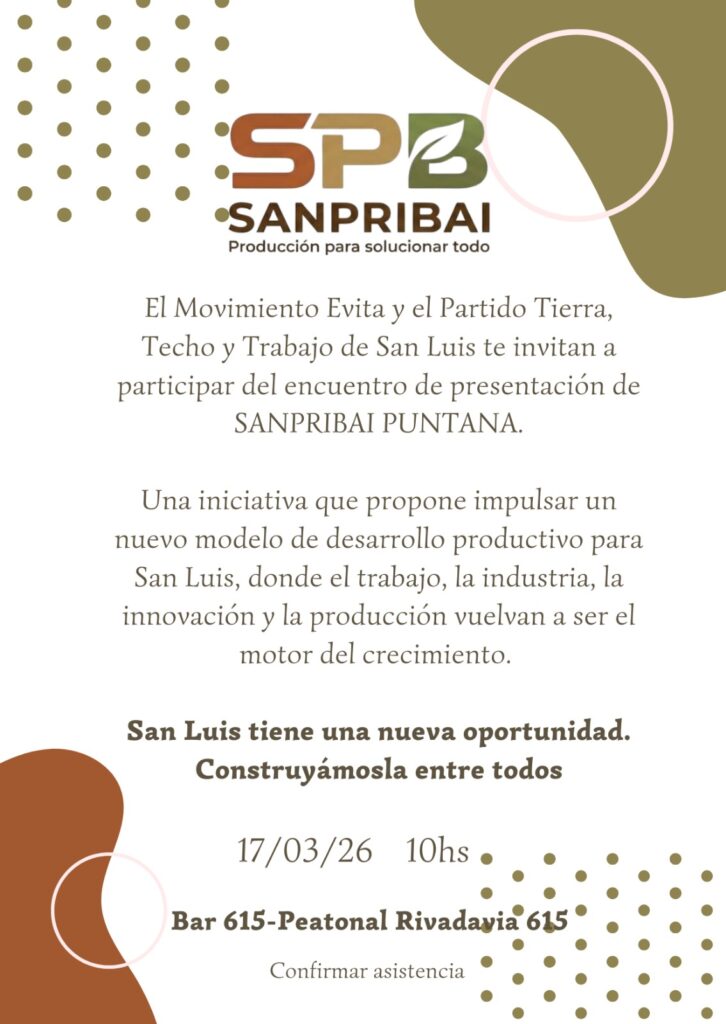 El Movimiento Evita y el Partido Tierra, Techo y Trabajo de San Luis convocaron a empresarios, comerciantes, productores, emprendedores, trabajadores de la economía popular, organizaciones sociales y dirigentes políticos a participar del encuentro de presentación de Sanpribai Puntana, una iniciativa que busca impulsar un nuevo modelo de desarrollo productivo en la provincia.