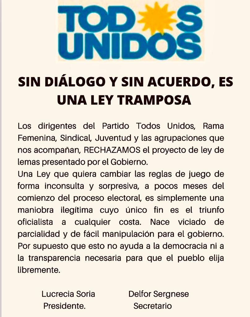 Todos Unidos, el espacio que se referencia en el senador Adolfo Rodríguez Saá y que preside Lucrecia Soria consideró que la Ley de lemas que impulsa el Gobernador Rodríguez Saá «sin diálogo y sin acuerdo, es una ley tramposa».