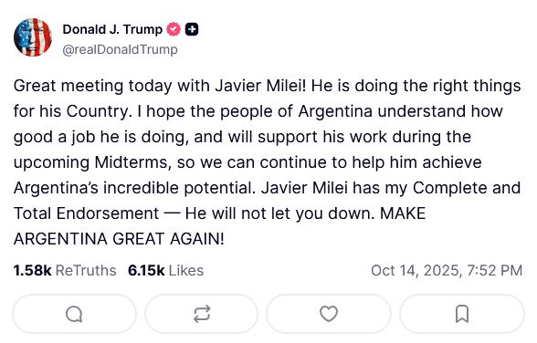 “¡Excelente reunión la de hoy con Javier Milei! Está haciendo lo correcto por su país. Espero que el pueblo argentino comprenda su excelente labor y que la apoye durante las próximas elecciones intermedias para que podamos seguir ayudándolo a alcanzar el increíble potencial de Argentina. Javier Milei cuenta con mi total apoyo. No los defraudará. ¡Hagamos que Argentina vuelva a ser grande!”, escribió Trump en su red social Truth Social, en un mensaje que replicó rápidamente en los medios internacionales.