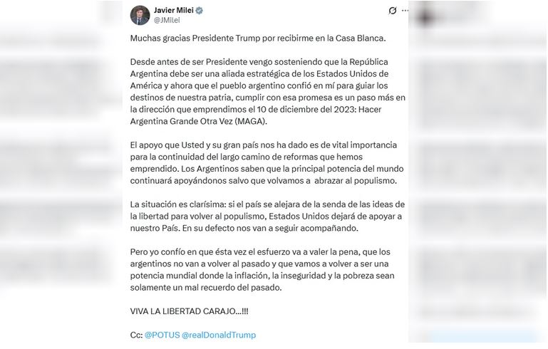 “La situación es clarísima: si el país se alejara de la senda de las ideas de la libertad para volver al populismo, Estados Unidos dejará de apoyar a nuestro país. En su defecto, nos va a seguir acompañando”, escribió el jefe de Estado.