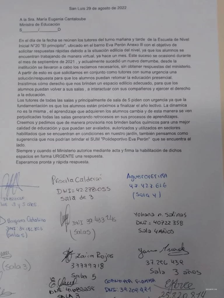 “Creemos y pedimos que de manera provisoria nos brinden baños químicos para una mejor calidad de educación y que puedan ser avalados, autorizados y utilizados en sectores habilitados que se encuentran en condiciones en nuestro jardín, también pensamos como sugerencia que nos podrían brindar el SUM “Polideportivo Eva Perón” que se encuentra al lado”