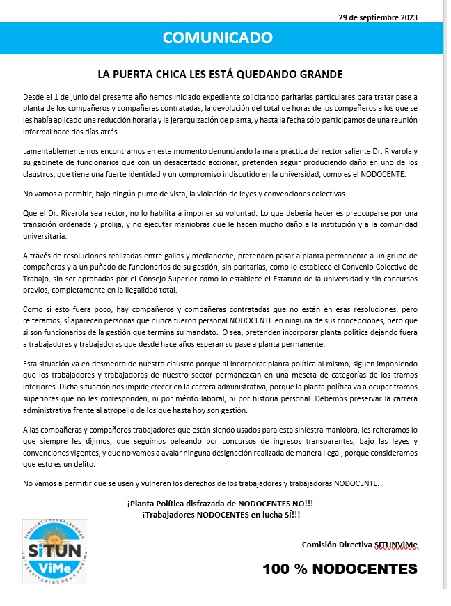 La Comisión directiva del Sindicato de Trabajadores Univeritarios (SiTUnViMe) denunció a través de un comunicado titulado “La puerta chica les está quedando grande” que el rector saliente de la Universidad Nacional de Villa Mercedes, David Rivarola intenta nombrar en planta permanente a personal político que lo acompañó en su gestión.