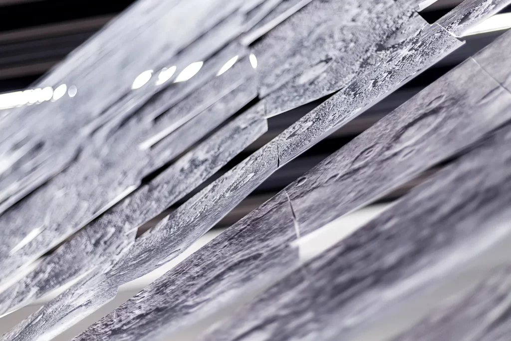El arquitecto Calvari instaló “La comprensión de Mercurio”, que es un planisferio colgante a unos 9 metros de altura, armado en una especie de wall (pared) de hojas colocadas una por una para integrar la imagen. Esa imagen reproduce la foto con más precisión que la humanidad alcanzó hasta ahora de la superficie de ese planeta, que es el más chico del sistema solar.